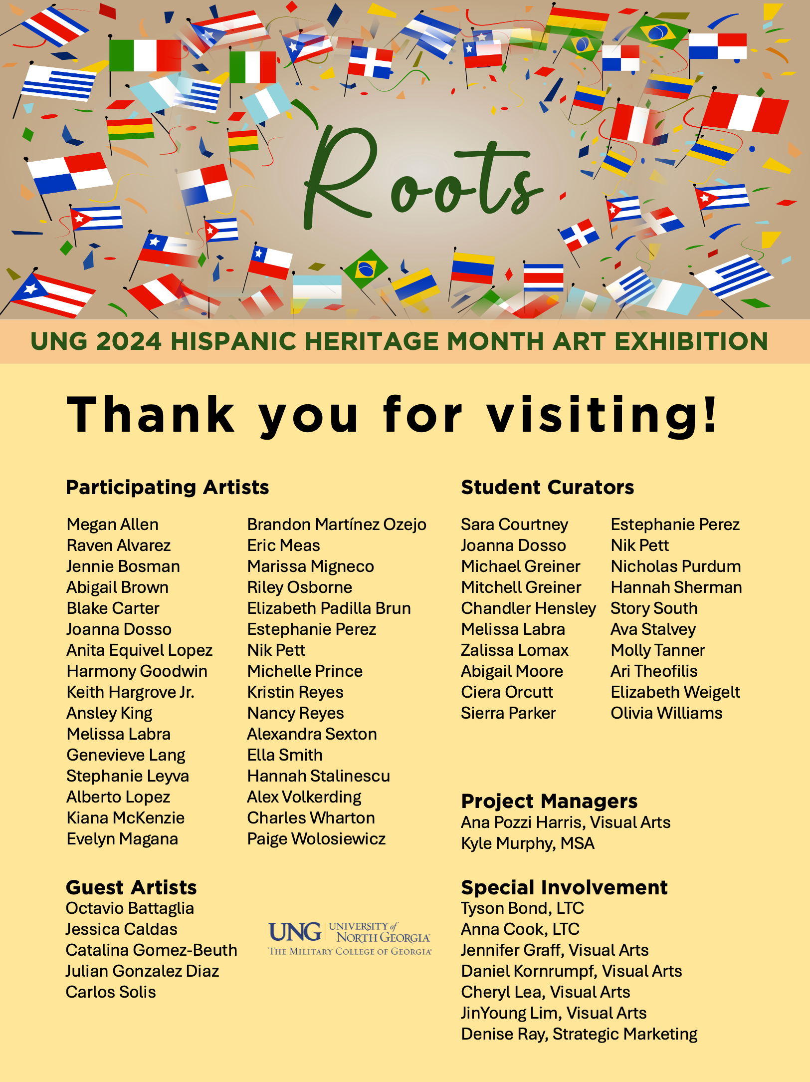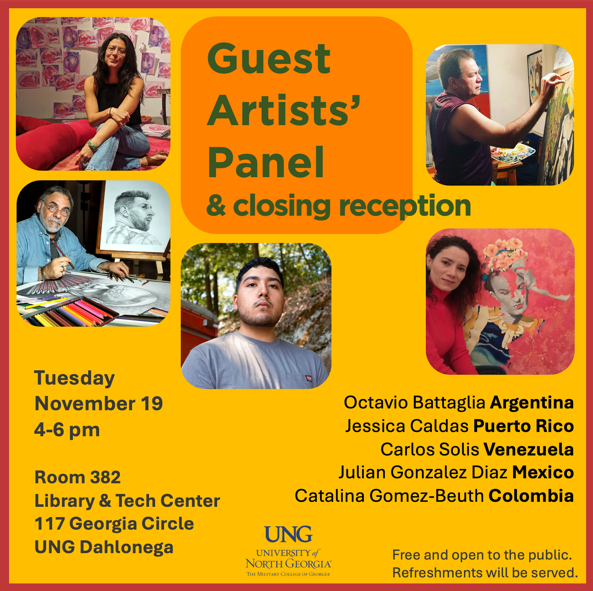 Roots - UNG 2024 Hispanic Heritage Month Art Exhibition is up and looking awesome. Check it out whenever the Library and Technology Center in Dahlonega is open (every day except Saturdays). And mark your calendars for the Guest Artists' Panel and Closing Reception! These talented artists will discuss their works and perspectives on art making. Tuesday, November 19th, from 4-6 pm, Room 382 Library and Technology Center, UNG Dahlonega. All artists will attend in person except Octavio Battaglia, who will be available for questions virtually, from Argentina.
